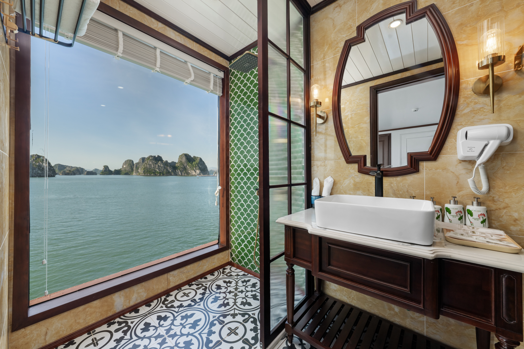 Phòng Deluxe là phòng duy nhất trên tàu không có ban công nhưng có cửa sổ lớn mở ra hướng biển rộng khoảng 20m2. Phòng rộng rãi, ấm cúng , có điều hoà, TV, bàn ghế & tắm shower và thiết kế Indochine đẹp từ những chi tiết nhỏ nhất