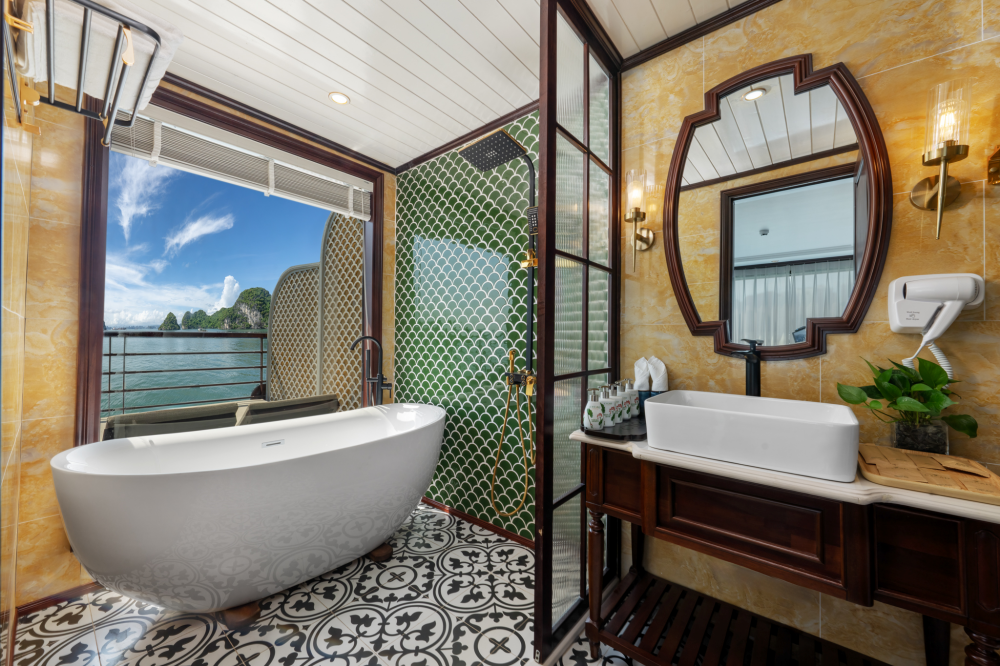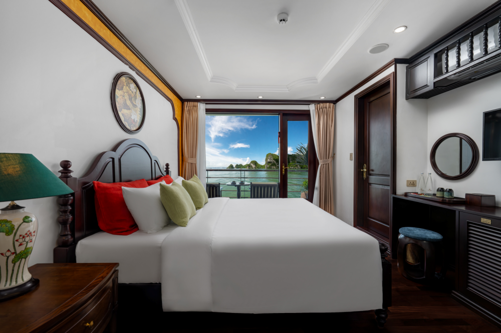Phòng được thiết kế tinh tế & đậm nét Indochine & phòng nào cũng có ban công rộng hướng biển.Có bồn tắm & shower , TV, bàn ghế , Air con rất tiện ngi . Ngoài ra khách còn được thư giãn 30′ massage khi đặt hạng phòng này