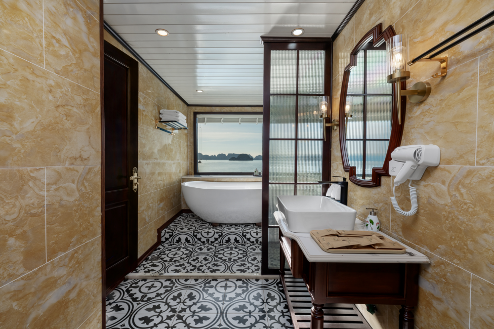 Sang trọng và tinh tế, Junior Balcony Suite toạ lạc tại tầng 1 du thuyền, diện tích rộng 32- 35m2, phòng nào cũng có ban công rộng view biển. Thiết kế ấn tượng theo phong cách Indochine cùng những tiện ích như bồn tắm thư giãn & tắm đứng riêng biệt, điều hoà,TV , bàn ghế thưởng trà & két sắt trong phòng