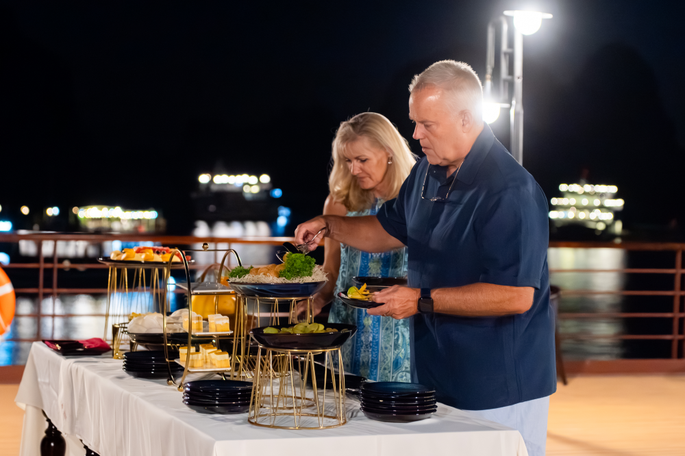 13.00 Having delicious fusion buffet lunch whistle our boat cruising leisurely to the heart of Bai Tu Long Bay